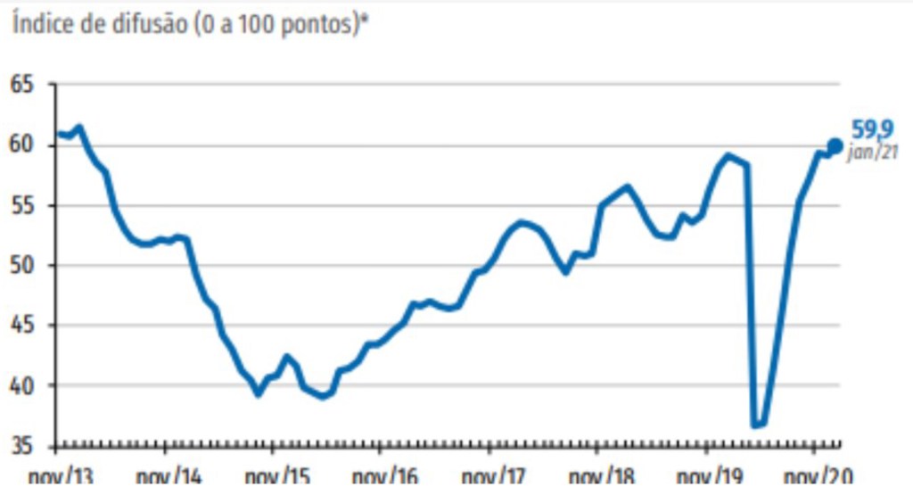 A propensão a investir do empresário aumentou em janeiro de 2021. De 59,1 pontos no último mês de 2020 para 59,9 no primeiro de 2021. O índice retoma a trajetória de recuperação que tomou curso ao longo de 2020, acumulando alta de 23,2 pontos desde abril.