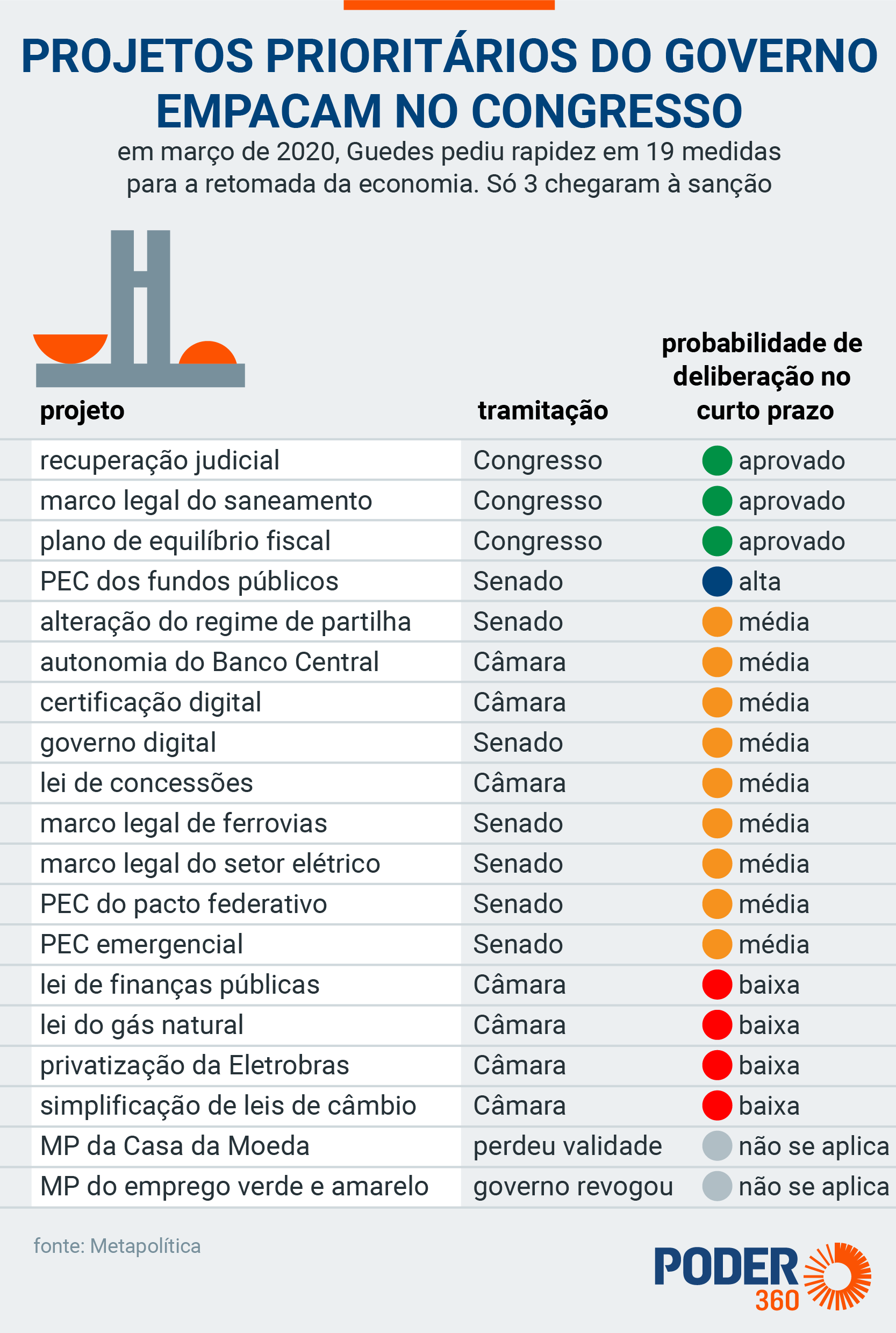 O ministro da Economia, Paulo Guedes, pediu em março, no início da pandemia, a aprovação de 19 propostas para “blindar” a economia contra o coronavírus. Só 3 foram sancionadas até o fim de 2020. É o que revela levantamento da Metapolítica, feito a pedido do Poder360.